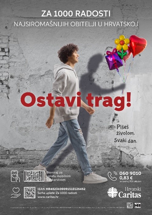 Hrvatski Caritas u suradnji s Ministarstvom znanosti, obrazovanja i mladih provodi projekt pomoći preko tisuću najsiromašnijih obitelji: Za 1000 radosti, a geslo ovogodišnje akcije je Ostavi trag!. Projekt se provodi u osnovnim školama u Hrvatskoj, a nositelji projekta su naši vjeroučitelji.